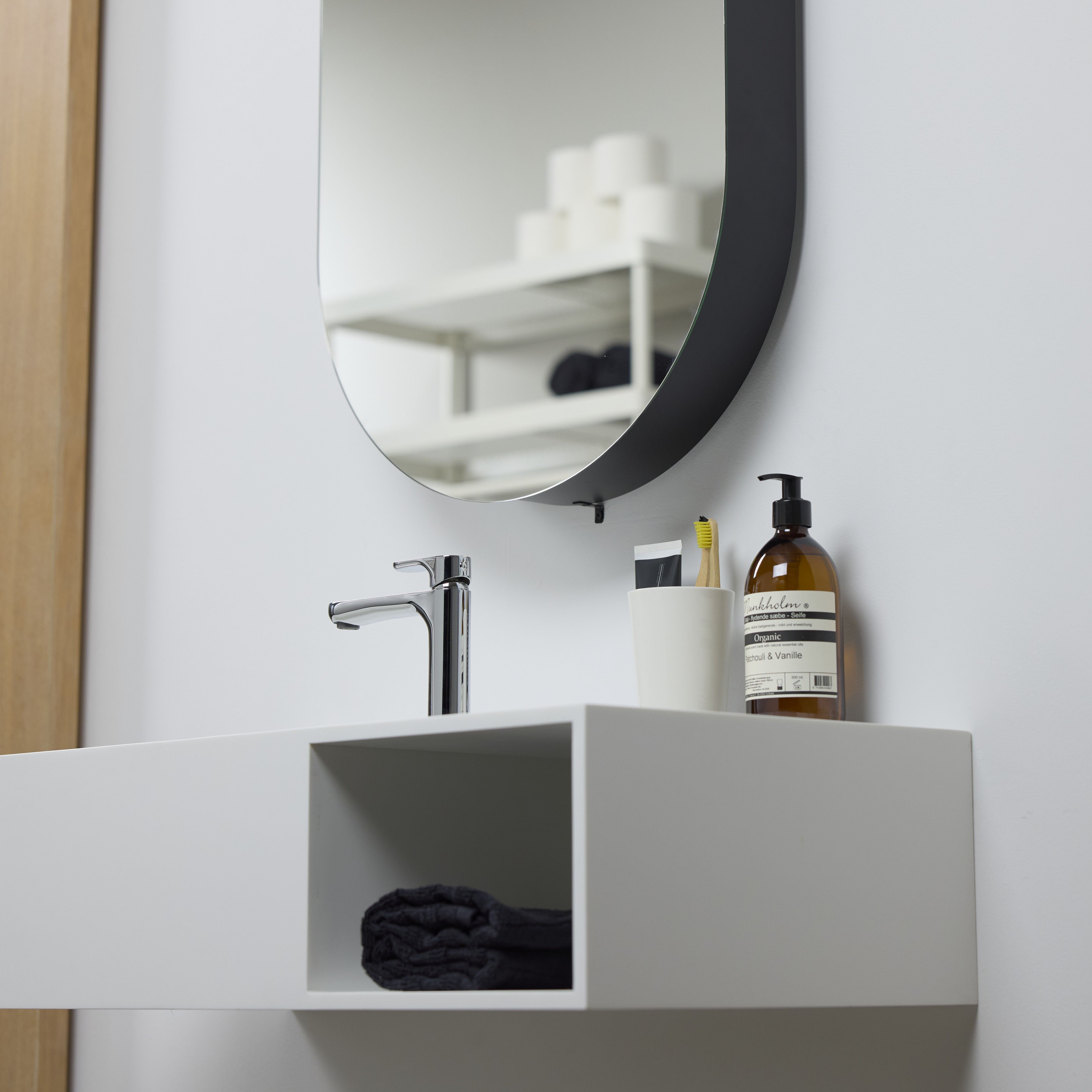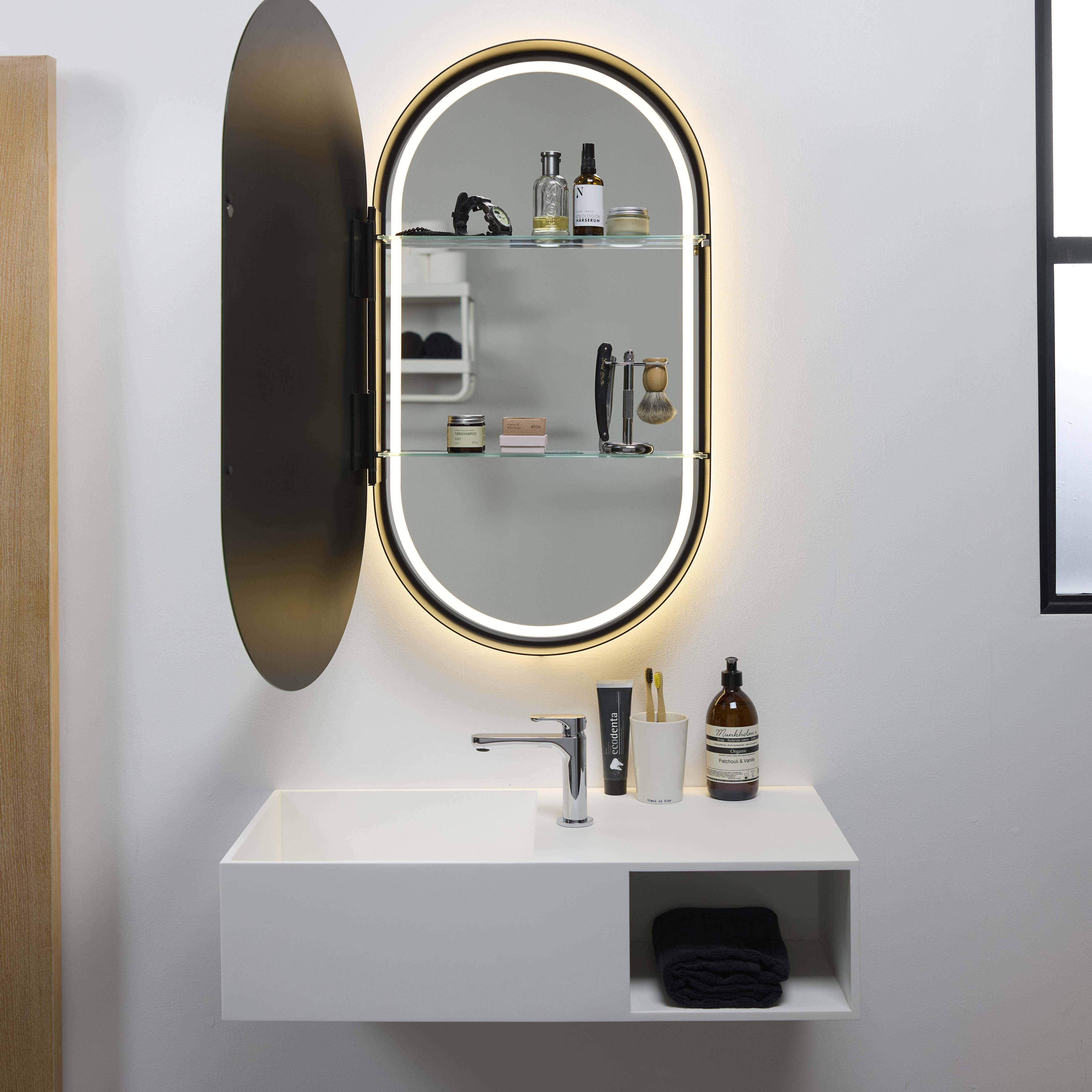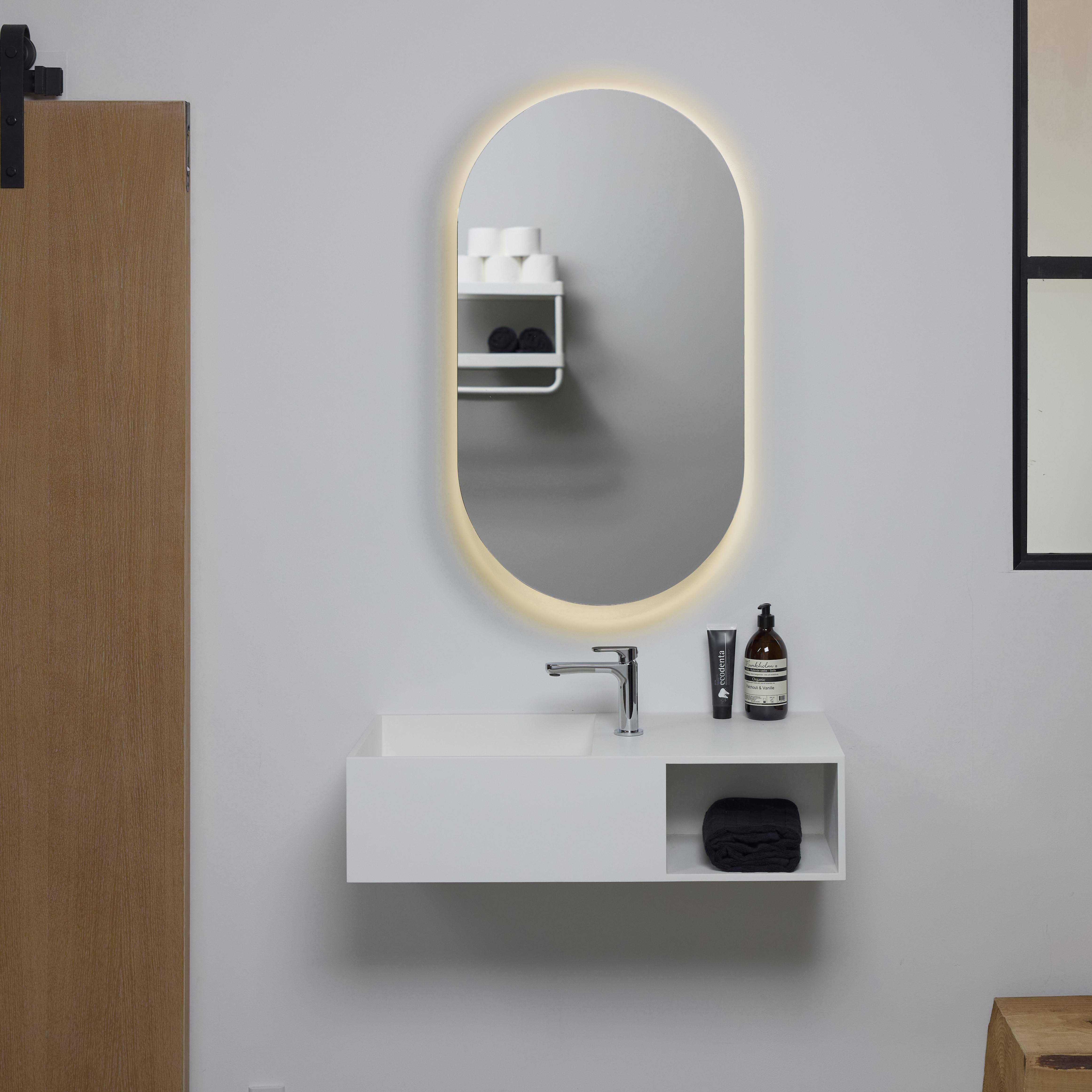 Den ovala formen ger spegelskåpet ett mjukt och enkelt uttryck som passar i både små och stora badrum. Det integrerade ljuset ligger jämnt fördelat längs kanten och ger spegeln en svävande effekt på väggen.