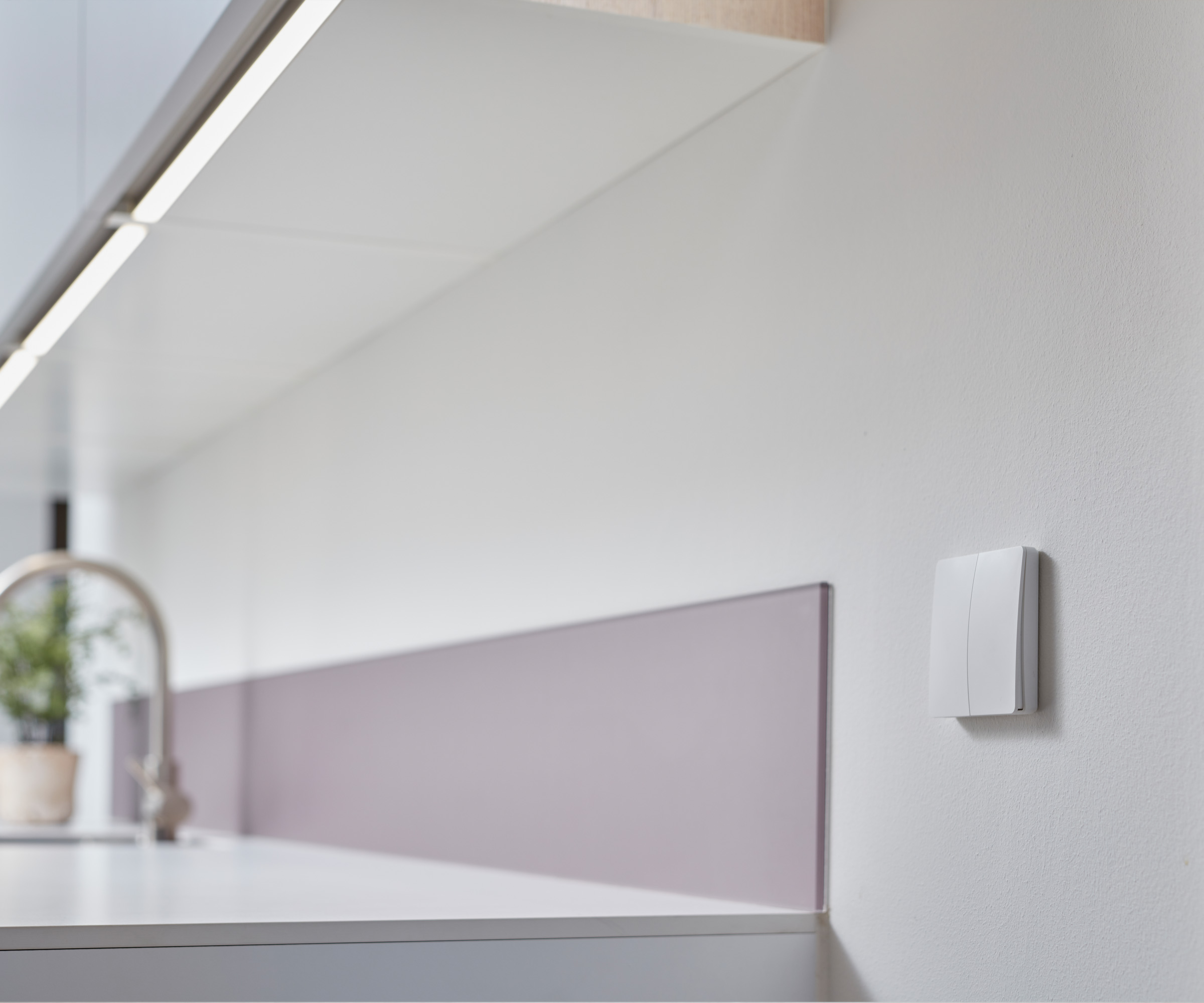 Trådlösa Kinetic Switch fungerar som en fjärrkontroll. På fjärrkontrollen kan du styra ljusstyrka, slå på och av ljuset. För att styra ljuset med Kinetic Switch behöver du en styrenhet, som är den enhet som kommunicerar med fjärrkontrollen. Styrenheten kopplar du enkelt ihop med drivdon och belysning.