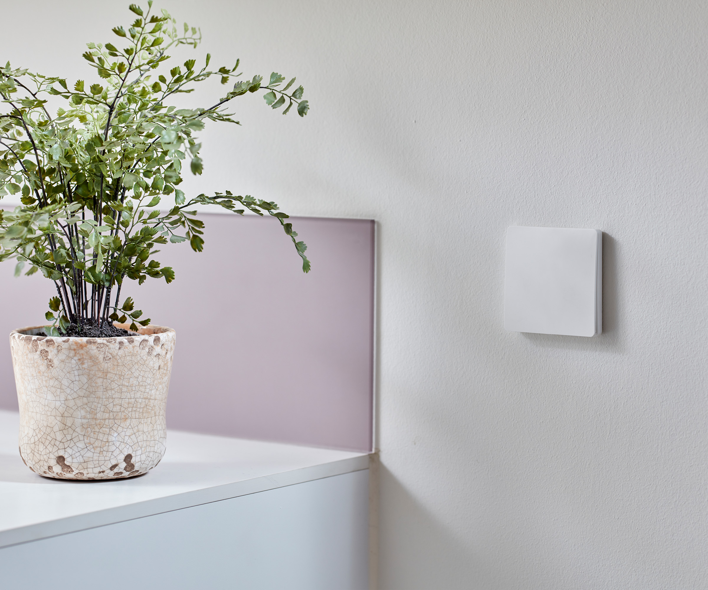 Kinetic Switch bruger hverken batteri eller anden ekstern strøm. Den lever udelukkende af den energi, du som bruger tilfører kontakten, når du trykker på den. Du kan montere den på væggen eller have den liggende i en skuffe eller på bordet - lige som du ønsker.