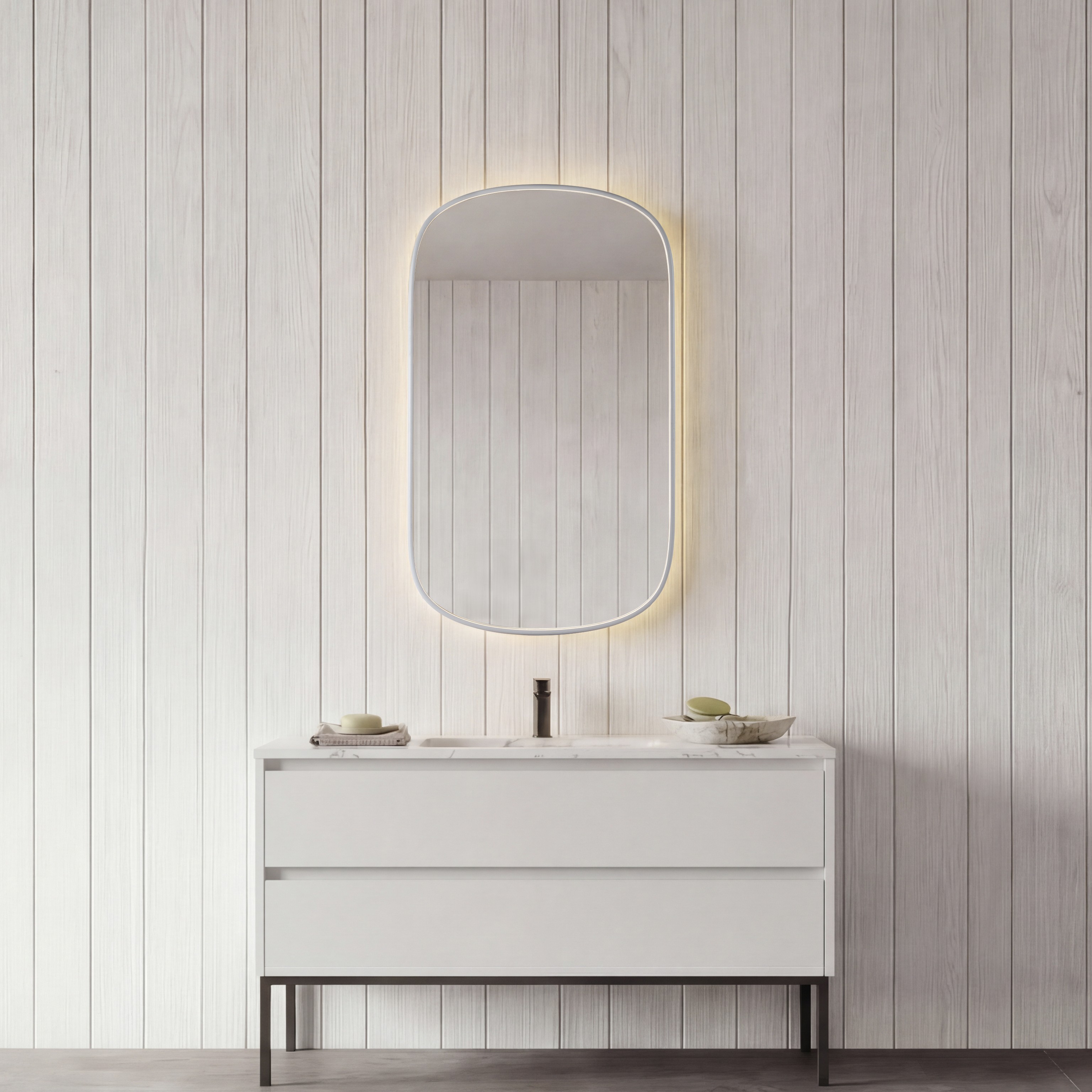 Bloom-spegeln är utrustad med två dolda ljuskällor för extra funktionalitet. Det atmosfäriska bakgrundsljuset och det funktionella frontljuset. Det betyder att du kan slå på och av ljuskällorna och skapa önskad atmosfär efter behov. Använd bakgrundsljuset för att skapa en mysig atmosfär och frontljuset när du behöver tydlig och effektiv belysning för de dagliga rutinerna.
